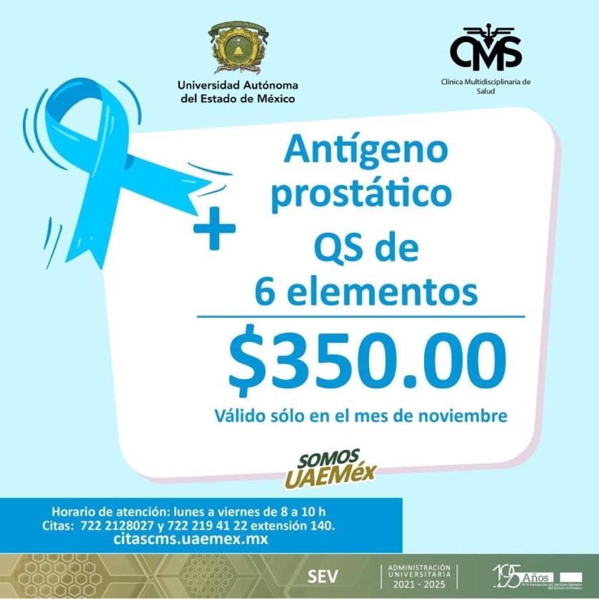 Toluca, Estado de México, 08 noviembre 2023.- Con un paquete promocional, que consiste en un estudio de antígeno prostático, acompañado de uno de química sanguínea de seis elementos, por 350 pesos, la Clínica Multidisciplinaria de Salud (CMS) de la Universidad Autónoma del Estado de México (UAEMéx) fomenta la prevención del cáncer prostático entre la comunidad universitaria y público en general.