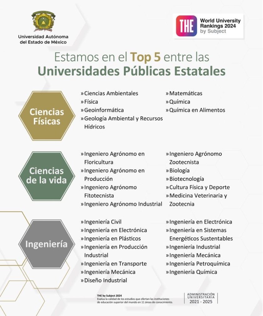 Toluca, Estado de México, 21 noviembre 2023.- La Universidad Autónoma del Estado de México (UAEMéx) ocupa el tercer lugar entre las Universidades Públicas Estatales de nuestro país en las áreas de Ciencias Físicas y Ciencias de la Vida y la cuarta posición en el área de Ingeniería del World University Rankings by Subject 2024 de THE (Times Higher Education).