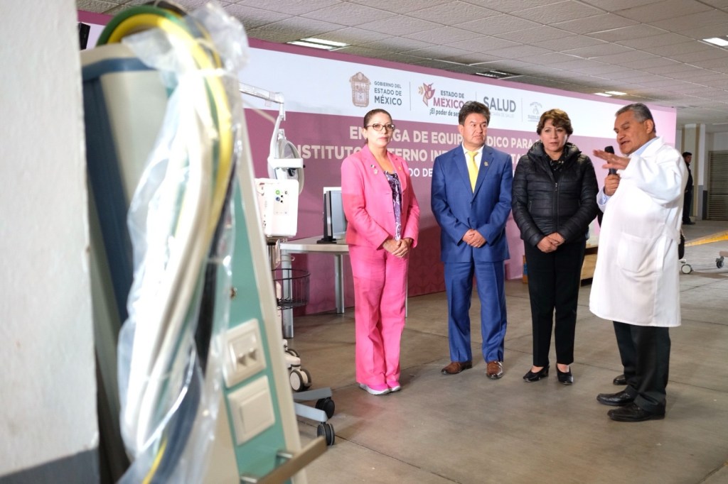 La maestra Delfina Gómez atestiguó la donación de equipo médico por parte del sector privado, realizada por la empresa Equiver, SA de CV, gestionada a través del Voluntariado del Instituto de Salud del Estado de México, el cual permite fortalecer los servicios hospitalarios al renovar los equipos de las áreas de urgencias, quirófanos y neonatos de ambos hospitales.