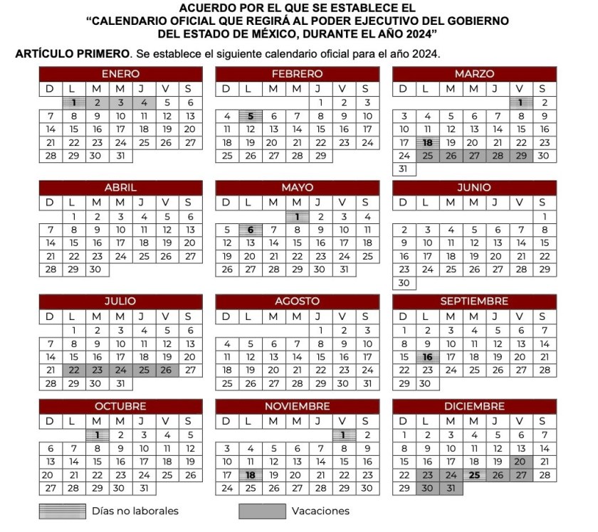 De acuerdo con la Gaceta oficial, este año tendrá 11 días no laborables: el 1 de enero, 5 de febrero, por la conmemoración del aniversario de la promulgación de la Constitución Política de los Estados Unidos Mexicanos; 1 de marzo por el 2 de marzo, 200 aniversario de la fundación del Estado de México; 18 de marzo, por el natalicio de Benito Juárez.