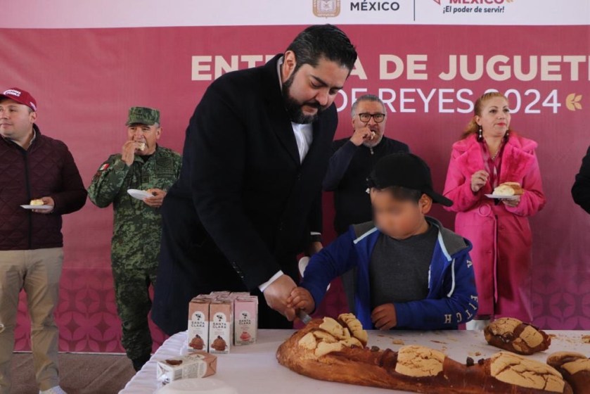 Texcaltitlán, Estado de México, 5 enero 2024.- Como parte de los festejos por la celebración del Día de Reyes y cumpliendo la instrucción de la gobernadora, maestra Delfina Gómez Álvarez, para dar seguimiento al esfuerzo transversal para la Construcción de la Paz en este municipio, el secretario de Seguridad, maestro Andrés Andrade Téllez y funcionarios del Gobierno del Estado de México acudieron para entregar juguetes y partir la tradicional rosca con las y los pobladores.