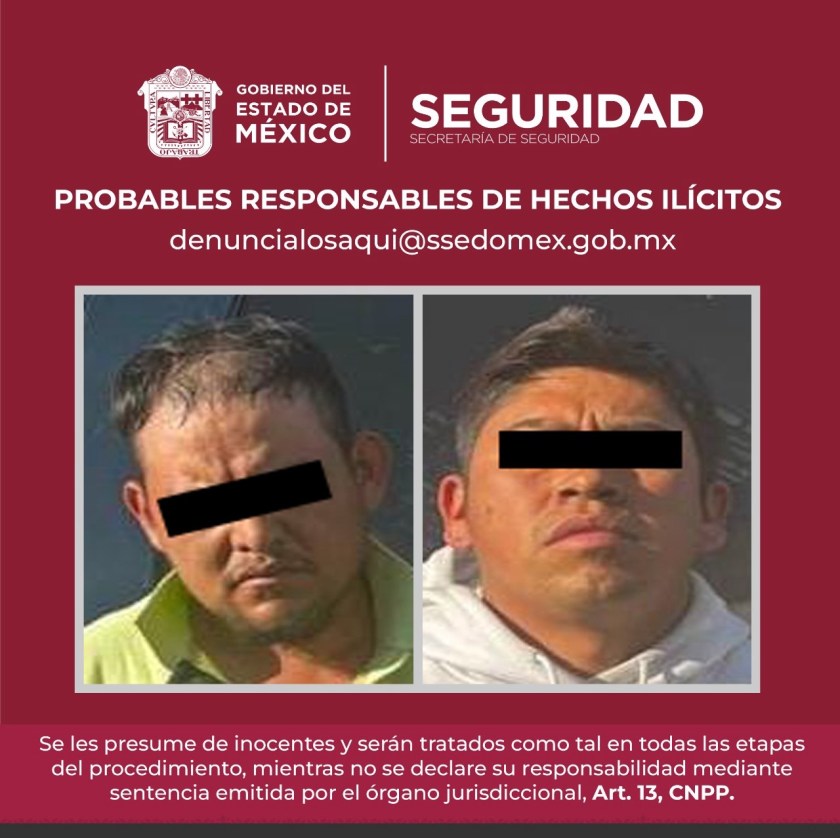 Texcaltitlán, Estado de México, 06 enero 2024.- Dos presuntos integrantes de La Familia Michoacana fueron detenidos por elementos de la Secretaría de Seguridad (SS), mientras realizaban actividades de «halconeo», a bordo de un taxi de la zona, a fin de informar sobre las acciones policiales que se realizan por parte de las fuerzas de seguridad.