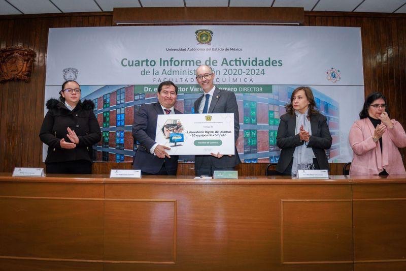 Al encabezar la lectura del cuarto informe de actividades del director de la Facultad de Química, Víctor Varela Guerrero, el rector entregó a la comunidad de esta facultad el Laboratorio Digital de Idiomas y 20 equipos de cómputo.