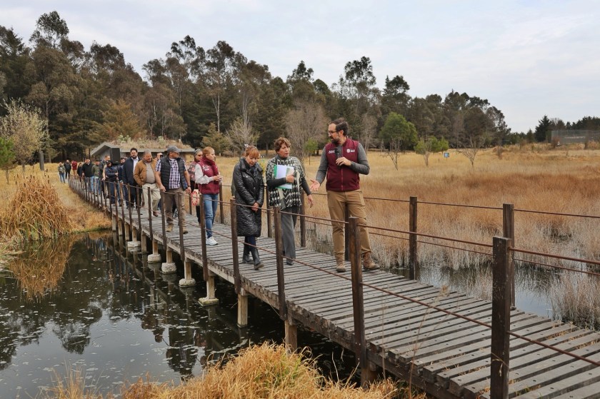 Acompañada por integrantes del gabinete estatal y de los presidentes municipales de Toluca, Metepec y Zinacantepec, la maistros se estra Delfina Gómez recorrió el Pabellón Hidro-Botánico y Planta de Tratamiento de Agua, meandros y humedales de tratamiento y conservación con los que cuenta el Parque Sierra Morelos.