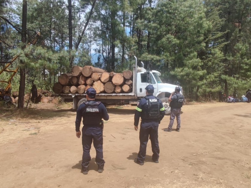 Además, los uniformados decomisaron un camión, color blanco, marca International, en cuya plataforma se trasladaba madera en trozo y aseguraron un tractocamión marca Ford, color blanco acondicionado con una pluma, así como dos motosierras.