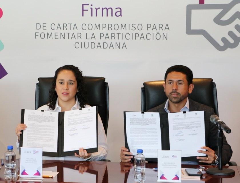 Toluca, Estado de México, 18 abril 2024.- El Instituto Electoral del Estado de México (IEEM) y el Consejo de Cámaras y Asociaciones Empresariales del Estado de México (CONCAEM) firmaron una carta – compromiso para fomentar la participación ciudadana que incluye la organización conjunta de conferencias y pláticas informativas; y ejercicios cívicos y difusión de las acciones que realiza el IEEM para promover la vida democrática de la entidad entre los miembros, integrantes, empleados y asociados a la organización empresarial.