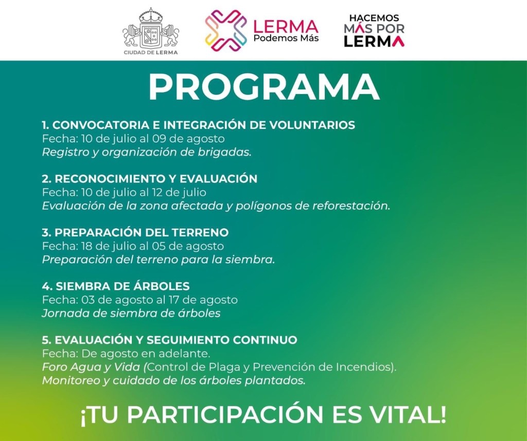 Con el objetivo de restaurar las zonas forestales de Lerma, el Ayuntamiento de Lerma, que encabeza el alcalde Miguel Ángel Ramírez Ponce, publicó la convocatoria del Programa Integral de Reforestación Agua y Vida 2024.