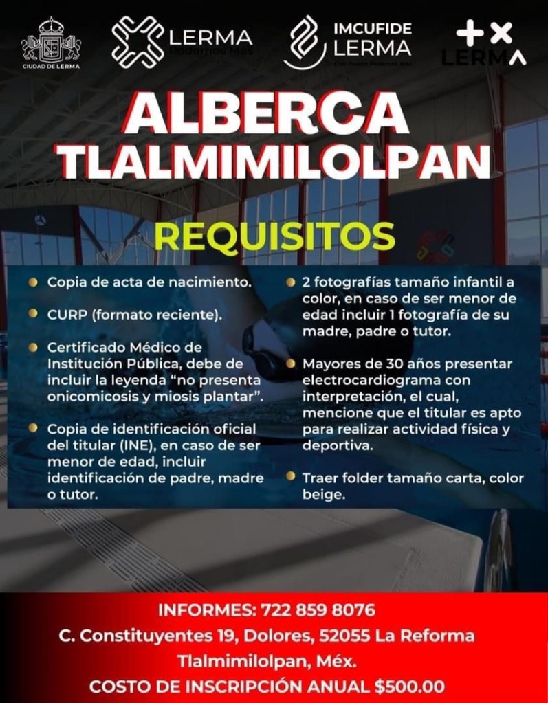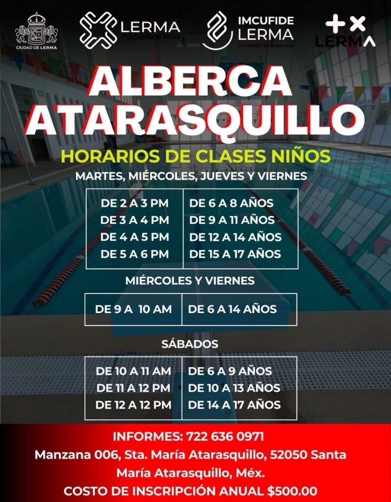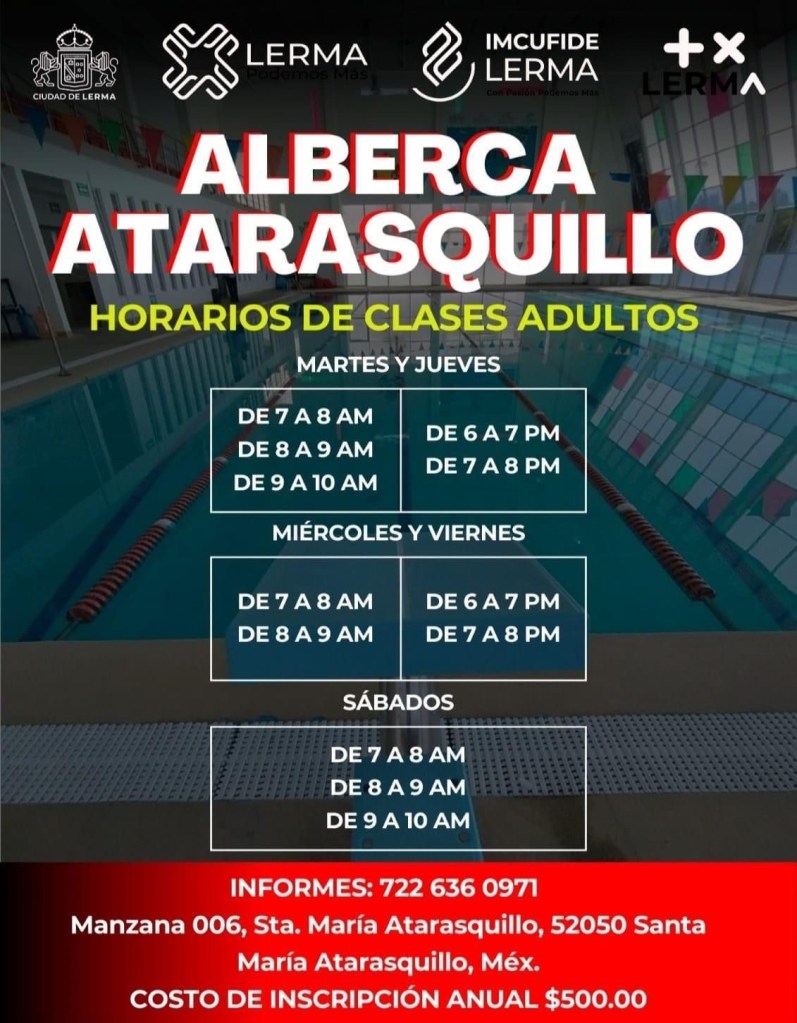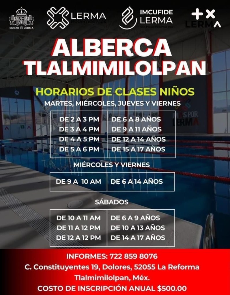 El Ayuntamiento de Lerma, a través del Imcufide, abrió las inscripciones para las clases de natación que se imparten en las albercas semiolímpicas de Santa María Atarasquillo y la colonia Reforma en Tlalmimilolpan, Lerma.