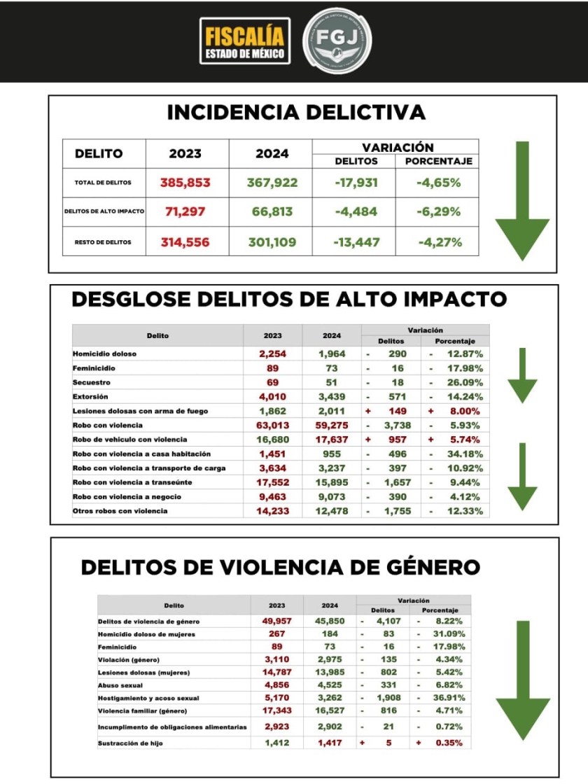 Con estas cifras, se concluye que, en el Estado de México, se registraron menos delitos durante el 2024, dentro de los cuales se observa una destacada reducción en la comisión de aquellos ejecutados con violencia, así mismo, la Fiscalía del Estado de México ha generado estrategias para combatir de manera prioritaria los delitos de alto impacto.