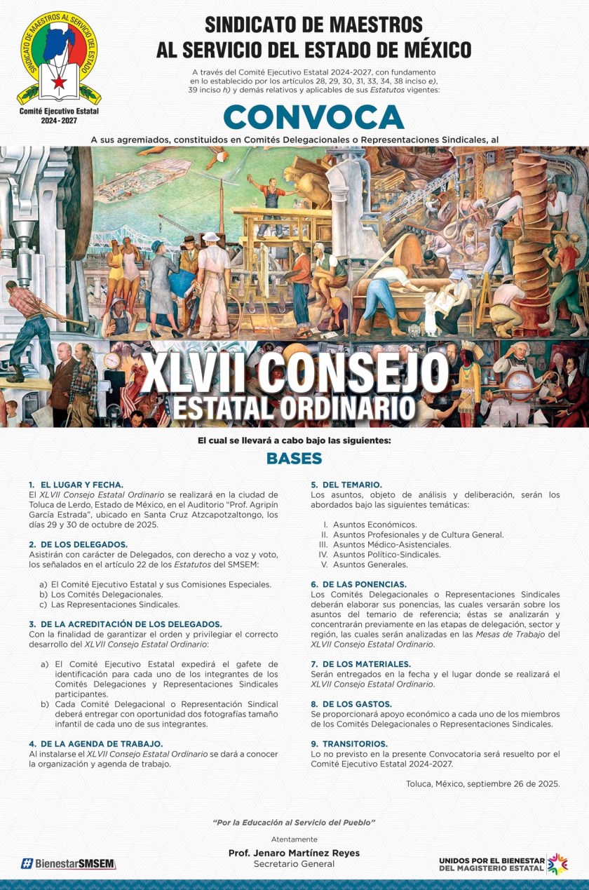 Toluca, Estado de México, 29 septiembre 2025.- El Sindicato de Maestros al Servicio del Estado de México (SMSEM), encabezado por su Secretario General, Jenaro Martínez Reyes, emitió la convocatoria al XLVII Consejo Estatal Ordinario, que se llevará a cabo los días 29 y 30 de octubre, en el Auditorio “Prof. Agripín García Estrada”, en Santa Cruz Atzcapotzaltongo, Toluca.