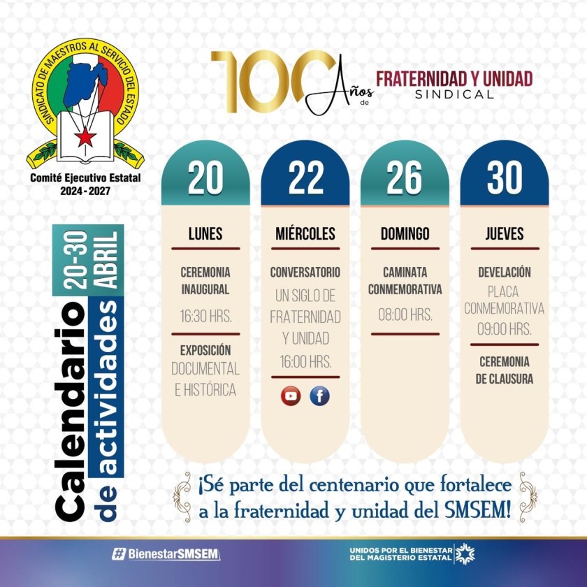 Toluca, Estado de México, 20 de abril de 2026.- El Sindicato de Maestros al Servicio del Estado de México (SMSEM) celebrará el centenario de un hito que se considera el origen de la organización magisterial en la entidad y que se remonta al 30 de abril de 1926 con la fundación de la Sociedad Mutualista de Maestros “Ánfora”, para ello, Jenaro Martínez Reyes, Secretario General, ha instruido la realización de actividades para conmemorar este hecho histórico.