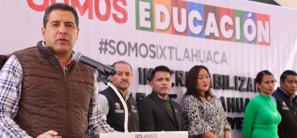Ixtlahuaca, México; 16 de noviembre de 20223. Abuzeid Lozano Castañeda, presidente municipal de Ixtlahuaca, encabezó la entrega de impermeabilizante para 40 instituciones educativas, con una