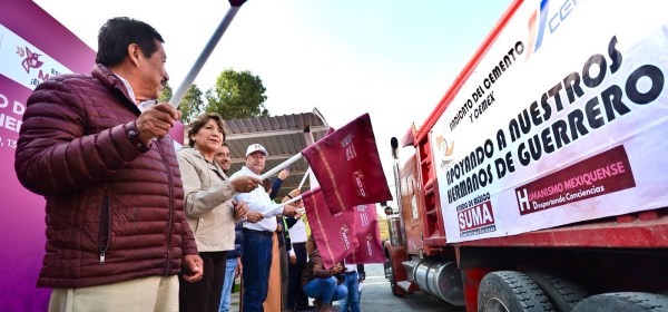Otumba, Estado de México.- La maestra Delfina Gómez Álvarez, gobernadora del Estado de México, dio el banderazo de salida a 60 camiones de volteo que