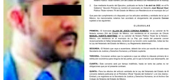 Toluca, Estado de México.- El Gobierno del Estado de México informa que Allan de Jesús Corona Romero, titular de la Notaría Pública 204, con residencia