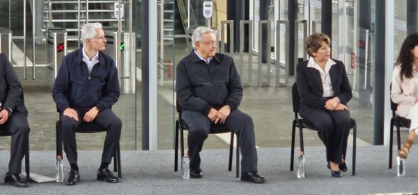 El presidente de México, Andrés Manuel López Obrador, acompañado de Alfredo Del Mazo Maza y Delfina Gómez Álvarez, gobernador saliente y gobernadora entrante del Estado