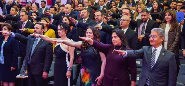 Ante la gobernadora del Estado de México, Delfina Gómez Álvarez, la diputada presidenta de la Mesa Directiva de la Legislatura local, Azucena Cisneros Coss y