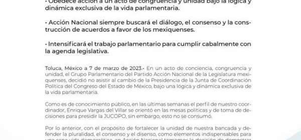 Toluca, Estado de México, 07 marzo 2023.- En un acto de conciencia, congruencia y unidad, el Grupo Parlamentario del Partido Acción Nacional en la LXI