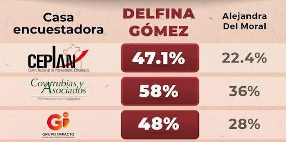De acuerdo con una revisión de todas las empresas encuestadoras más prestigiosas en México, la maestra Delfina Gómez Álvarez, próxima candidata de MORENA a gobernadora
