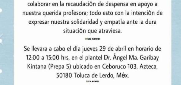 Con el propósito de apoyar a la docente del Plantel “Ángel Ma. Garibay Kintana” de la Escuela Preparatoria de la UAEM -Prepa 5- víctima de