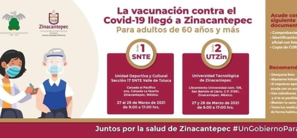 En Zinacantepec se llevará a cabo la vacunación de adultos mayores: los días 27, 28 y 29 de marzo de 2021, en la Unidad Deportiva