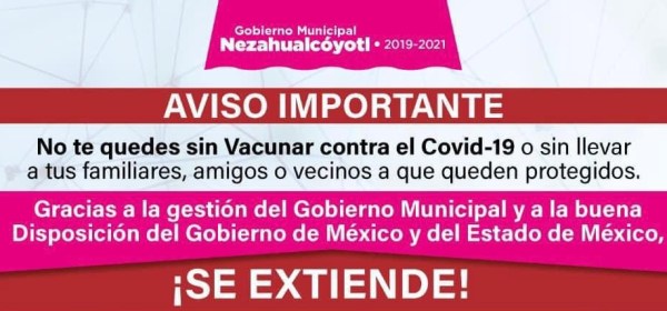 Se amplía un día más, hasta el jueves 25 de marzo, la vacunación en los tres módulos del municipio de Nezahualcóyotl, en beneficio de los