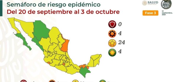 Ninguna entidad en rojo, 24 en amarillo y cuatro en naranja. Ciudad de México, México, 17 septiembre 2021.- Del 20 de septiembre al 3 de