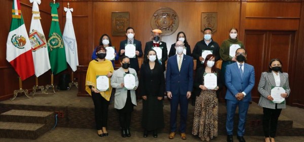 El rector de la UAEMéx, Carlos Eduardo Barrera Díaz, entregó 32 bases y 10 recategorizaciones a personal administrativo agremiado al SUTESUAEM. El secretario general del