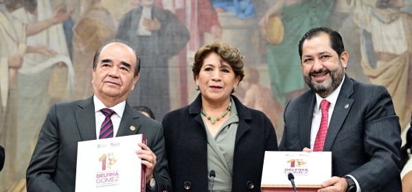 • La primera mujer en gobernar el Estado de México entrega personalmente el documento con logros y avances del primer año de su gobierno. •