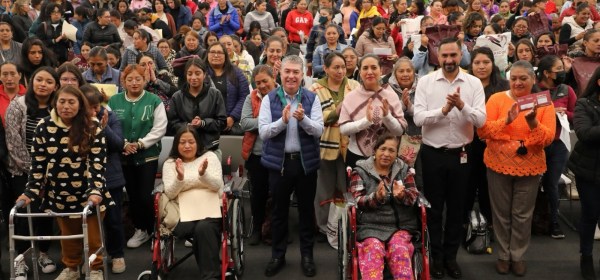 • El Secretario de Bienestar del Gobierno del Estado de México, Juan Carlos González Romero, entrega tarjeta de este programa y aparatos funcionales a personas